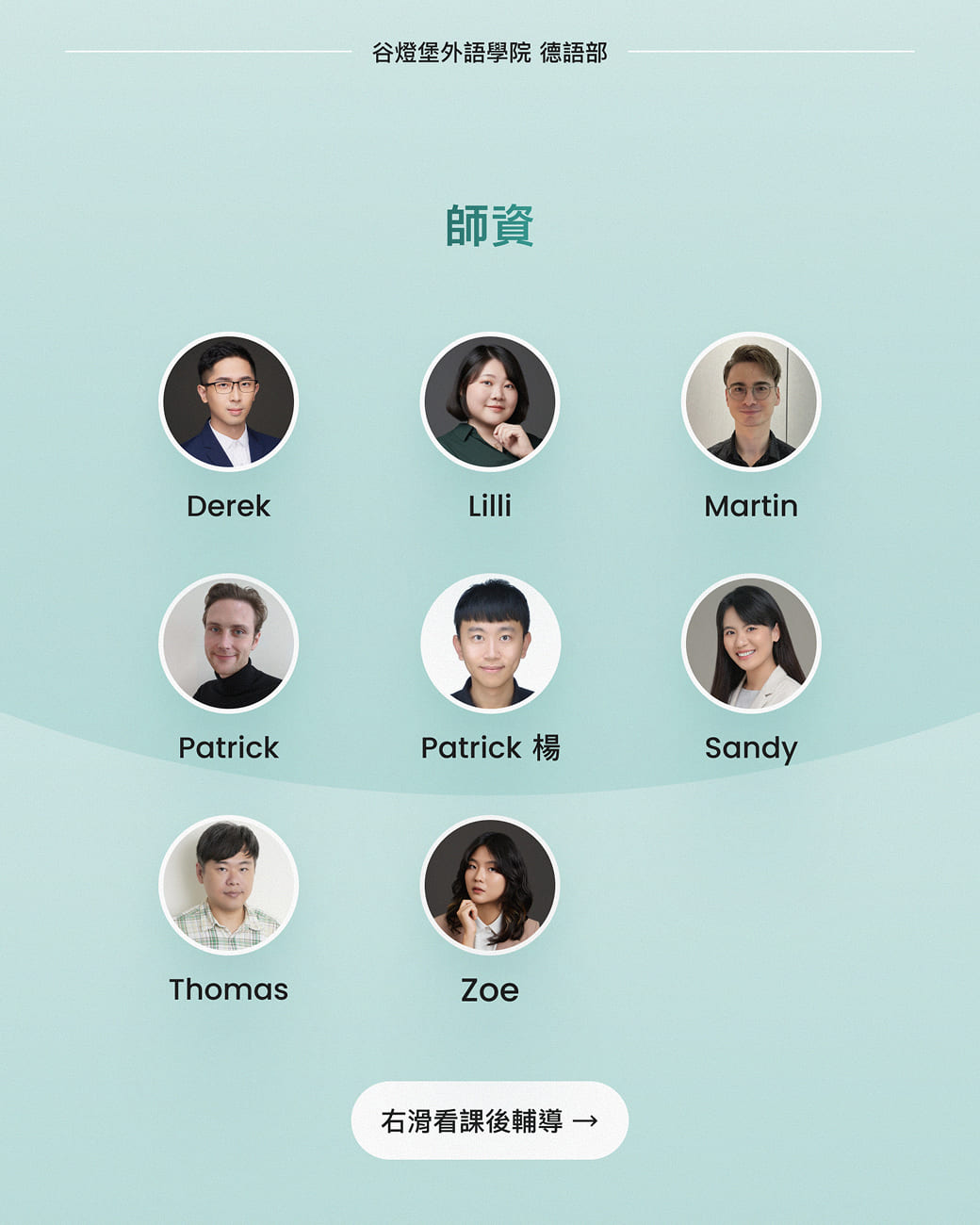 • 輔仁大學德文系畢業 • 德國耶拿大學德語教學系碩士班畢業 • 考場經驗豐富,持DSH2 考試證書 • 持Goethe Institut 歌德學院A2. B1. B2. C1證書 • 具有線上線下教學經驗,教學範圍涵蓋兒童與成人教學