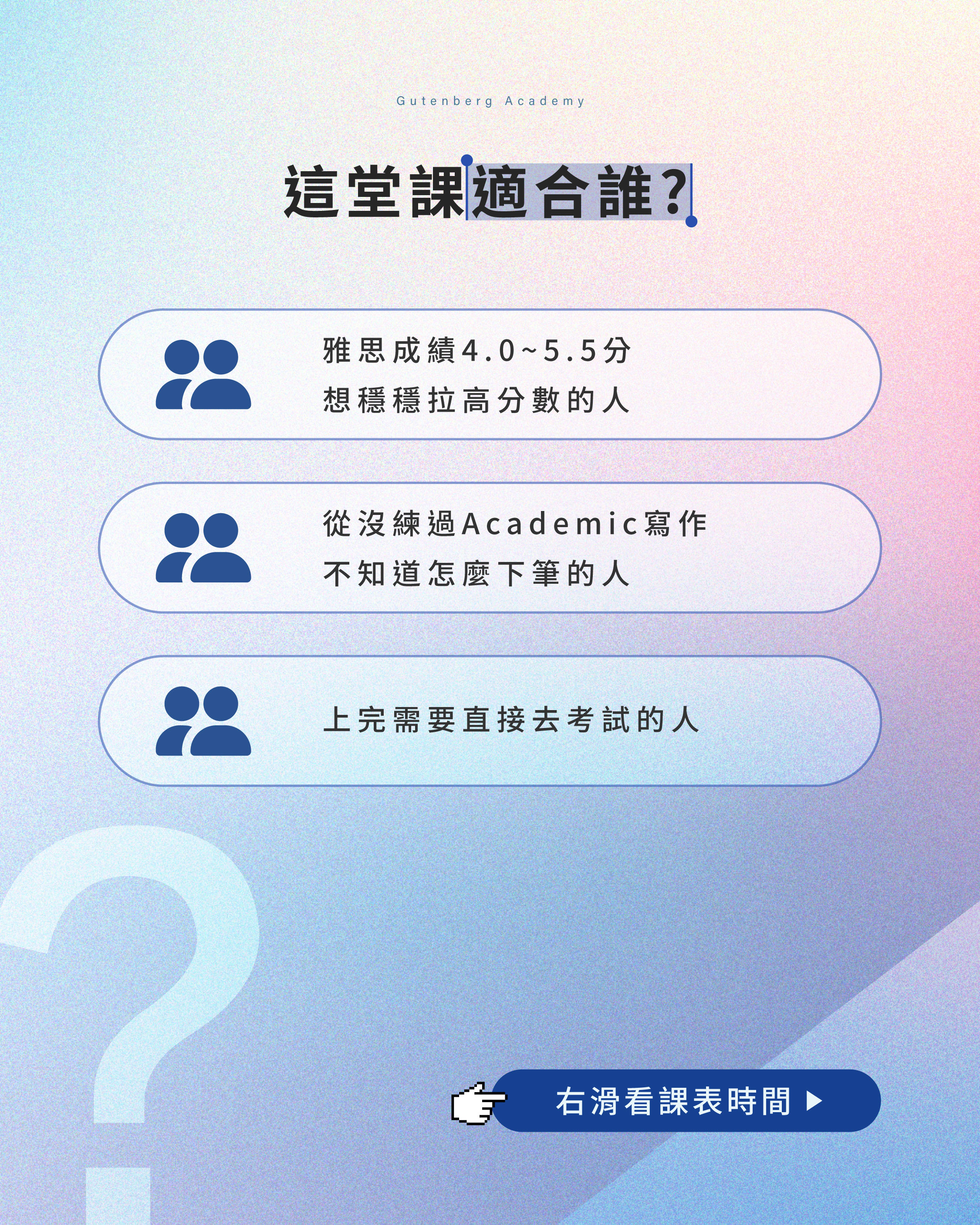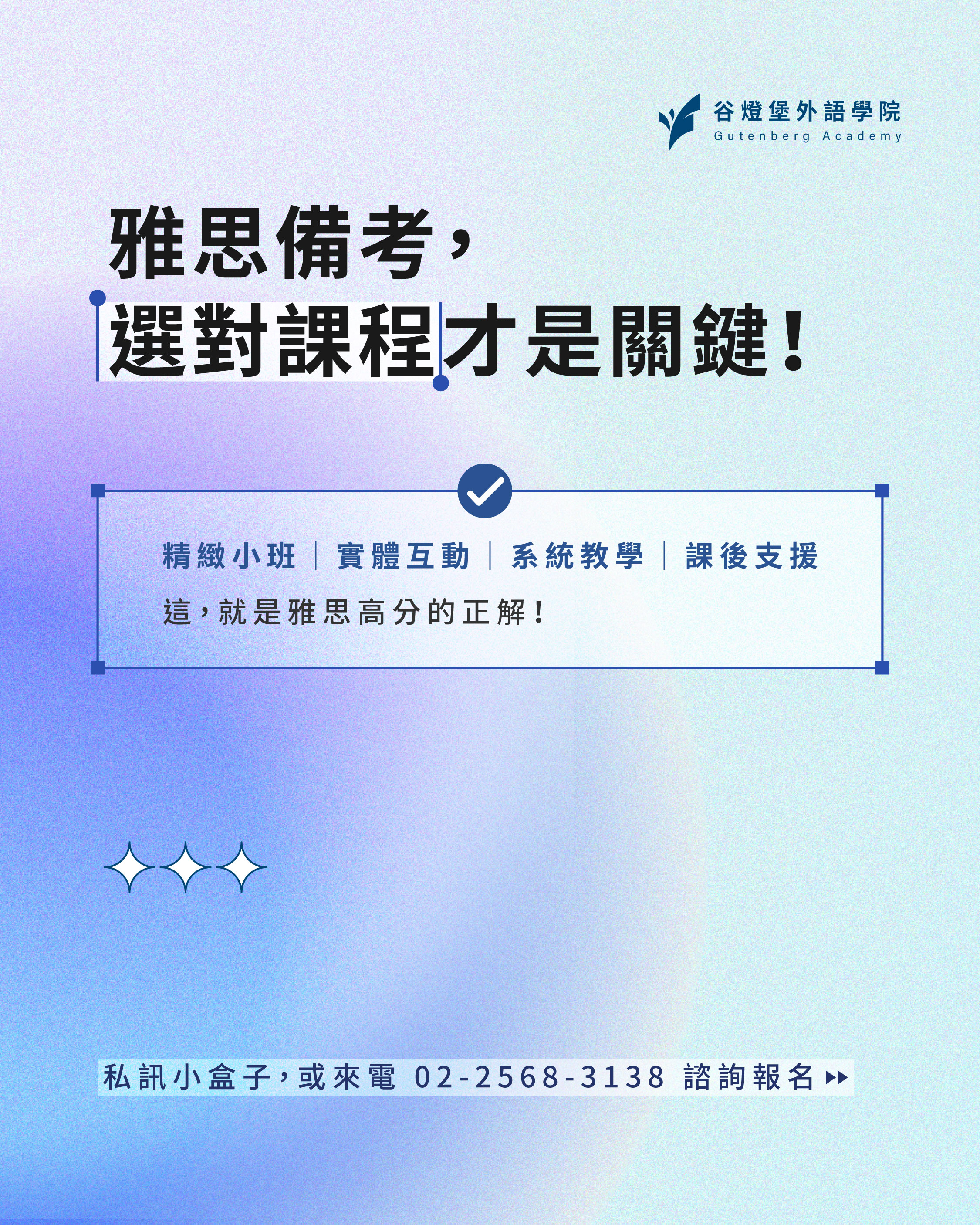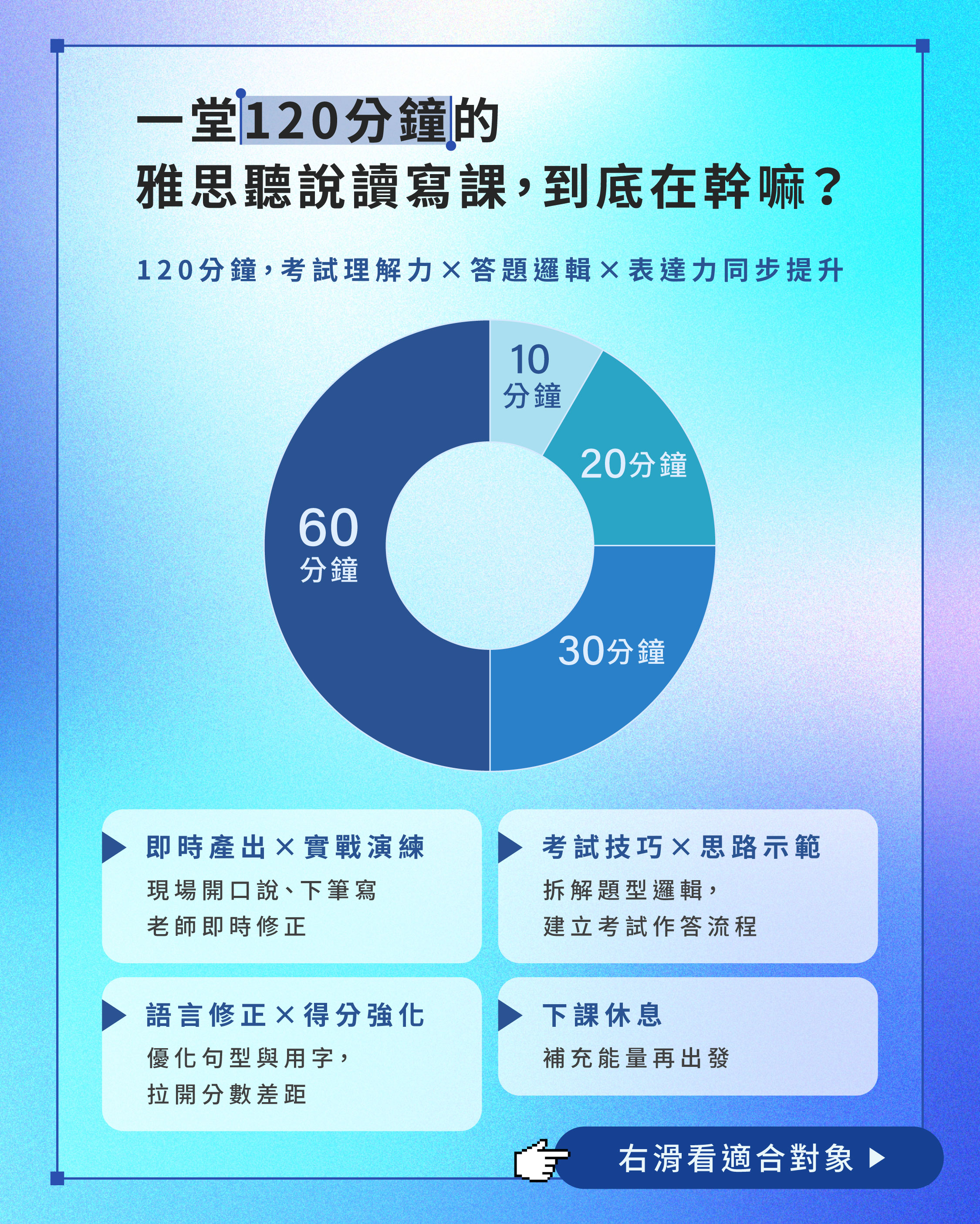「英文雅思聽說&讀寫-入門班」是專為台灣學子設計的雅思入門課程,強調聽、說、讀、寫四大能力的全面訓練。課程結合雅思考試的要求和台灣學生的學習特點,提供系統性的教學內容。透過豐富的口語練習、閱讀理解、寫作技巧指導和聽力訓練,幫助學生扎實打好英語基礎。專業師資將以生動有趣的方式引導學習。在我們的課程中,將近 8 成的學員在 2 個月內雅思成績上升 1~2 分!