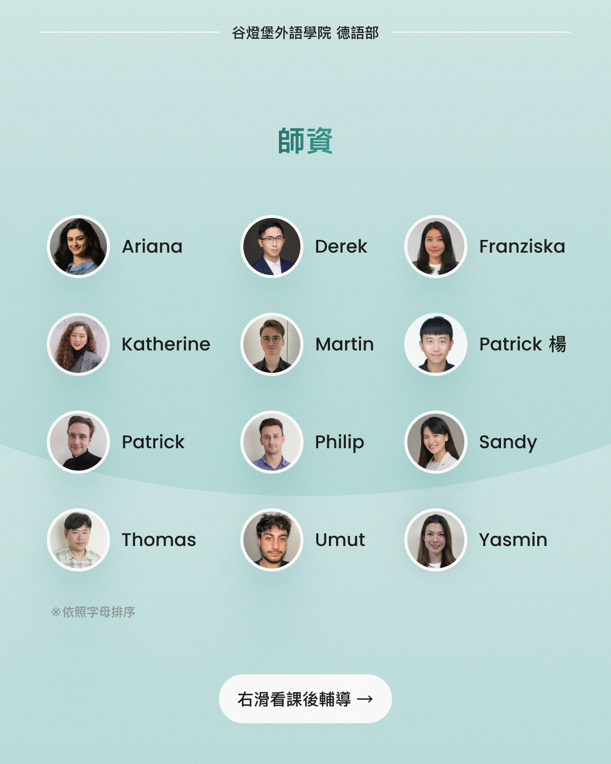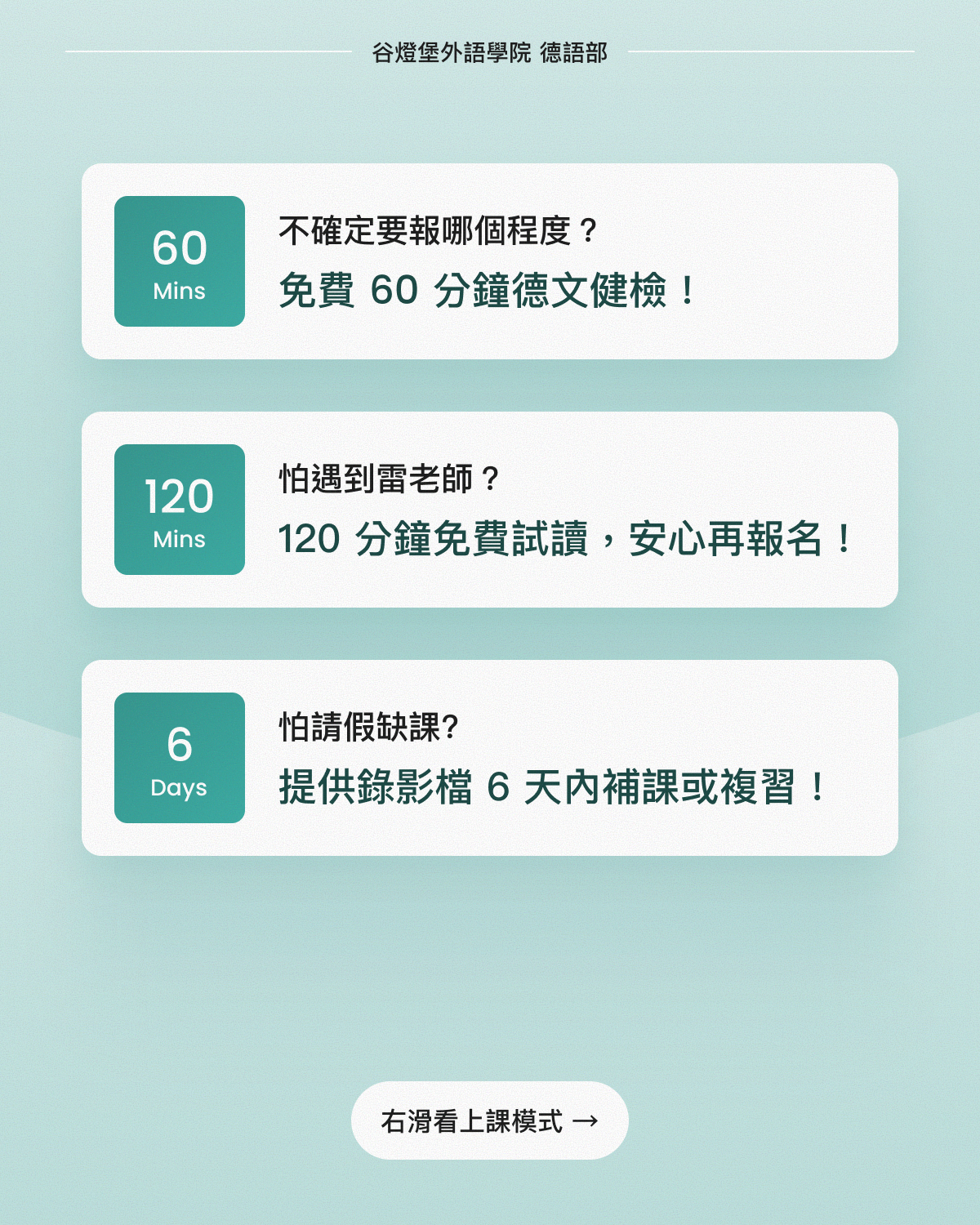 德文 A1 課程是谷燈堡外語專為初學者設計的基礎課程,教授學生基礎的德文聽、說、讀、寫以及文法能力。通過本課程,學生將學習基本詞彙和語法結構,能夠進行簡單的日常交流,如自我介紹、日常生活和購物等。課程內容豐富,包括發音練習、簡單對話和文化介紹,幫助學生建立對德語的興趣和自信。課程結業後有能力去應考德文 A1 檢定考。
